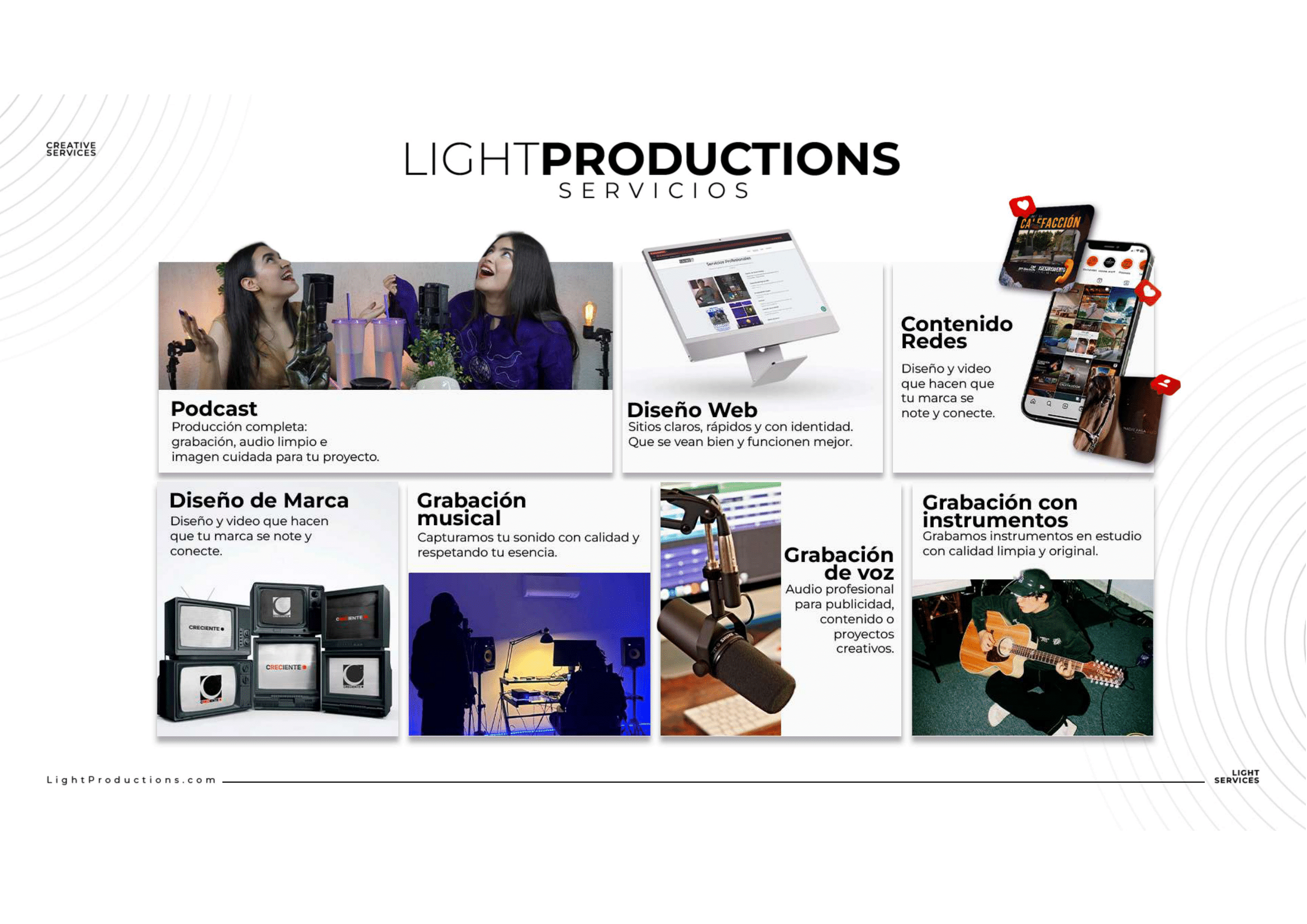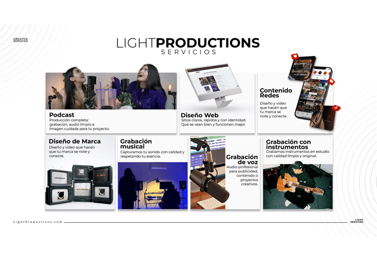Ofrecemos ingeniería en audio, producción digital, podcast, desarrollo web y gestión de redes sociales.